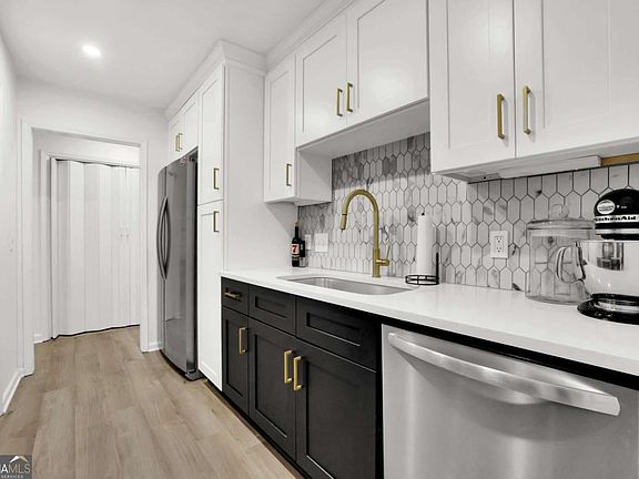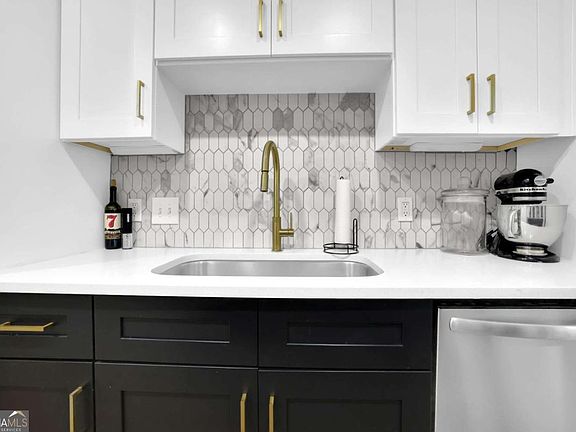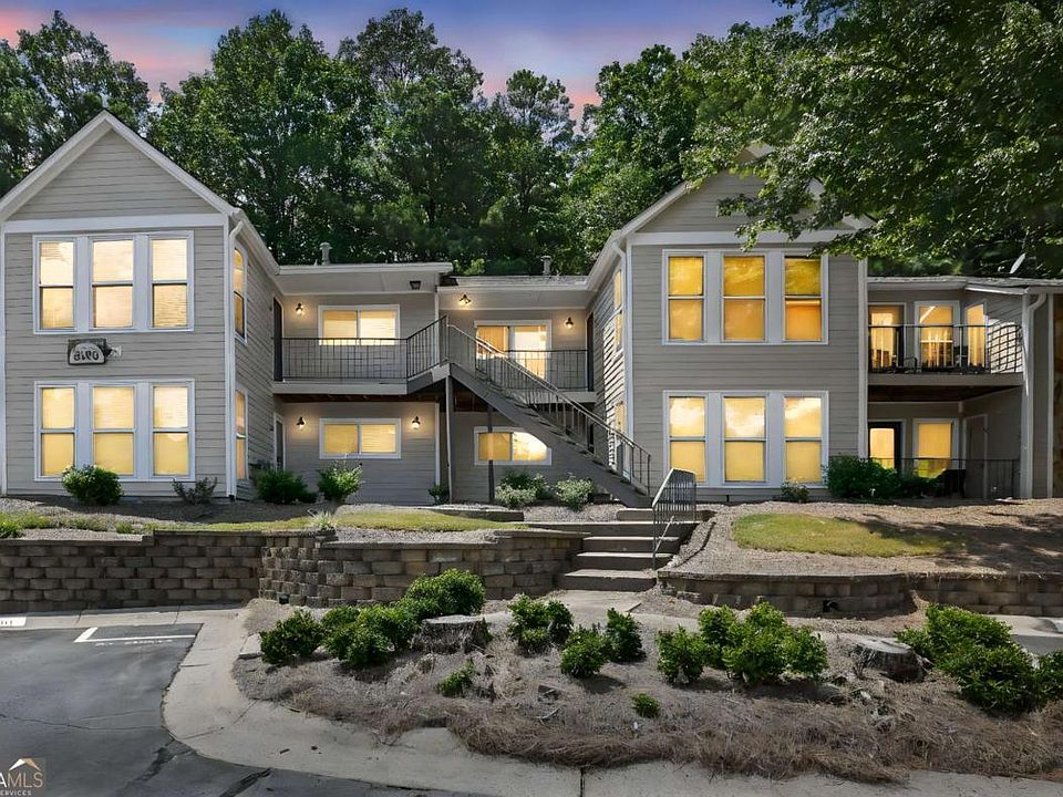 Beautifully maintained Roswell Condo in Prime Location! This lovely ground-level unit features quartz countertops in kitchen & owner's bath, stainless appliances, soft-close cabinets with pull-out trash & pantry, tile in all wet areas, Shaw LVP flooring (no carpet), designer lighting, LED can lights, and fandeliers in bedrooms. Elegant trim details at fireplace, owner's suite & guest bath, plus stylish wallpaper in owner's bath. Freshly painted with Sherwin Williams Duration washable-flat paint and upgraded brushed nickel hardware throughout. Enjoy a private, wooded view from the back patio. Community amenities include a lake with dock, pool, and ample guest parking. One assigned parking spot. Unbeatable location: just 2.5 mi to Downtown Roswell, 0.4 mi to shopping & gas, 2.4 mi to The Avenue East Cobb, and 2.6 mi to the Chattahoochee Nature Center. Move-in ready and truly a must-see!