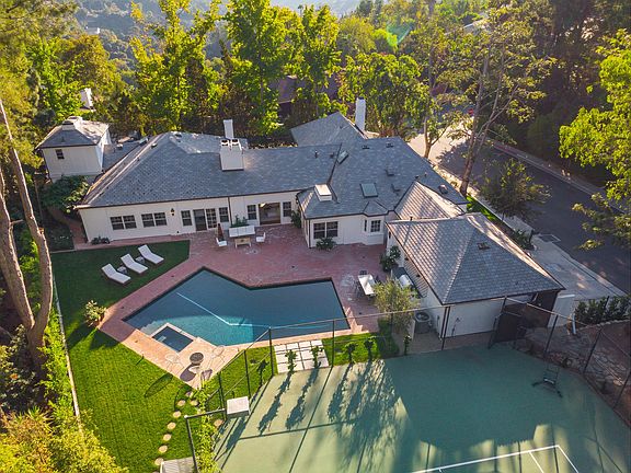 Traditional tennis court estate on a quiet cul-de-sac in Benedict Hills Estates. Styled with rich finishes and sophistication this home is designed for both casual and formal entertaining. A thoughtful floor plan with 5 bedrooms 6 baths on sprawling grounds with lush greenery. Formal spaces, drenched with natural light, includes a grand dining room and living room with fireplace. The Family room has vaulted ceilings, fireplace, bar, and opens to the kitchen, pool & courtyard. The kitchen showcases handcrafted Christopher Peacock cabinets, Wolf range, a large island & breakfast area. The Master suite is appointed with luxe details including a wood-burning fireplace, walk in closet, separate vanities, soaking tub & shower. Three large secondary bedrooms, all en-suite with natural light. A fifth bedroom and bath with a private entrance, along with separate guest quarter with kitchenette & balcony. Features a championship lighted tennis court, outdoor kitchen, pool & spa, and 3 car garage.