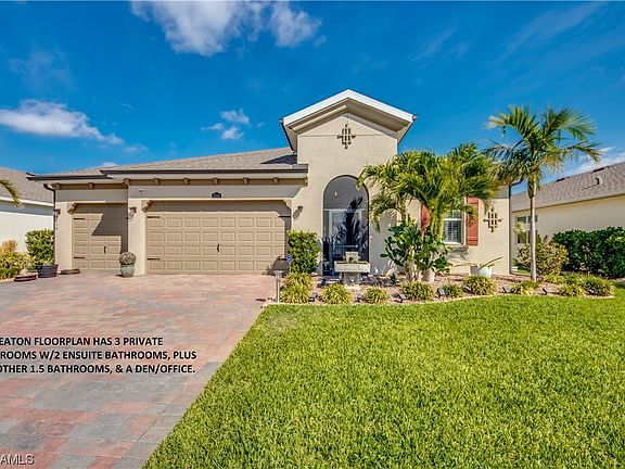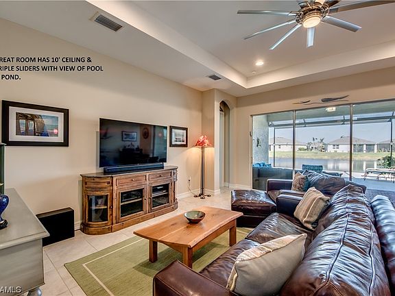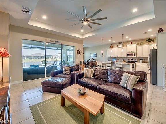 BEST PRICED HOME OF ITS KIND ON THE MARKET IN CAPE CORAL-WATERFRONT, GATED, POOL, 3 CAR GARAGE. Only waterfront pool home on the market in ENTRADA consists of over 2,500 sf of living space plus a SCREENED LANAI that runs the width of the home. Shopping & dining less than 2 miles away & QUICK ACCESS TO DOWNTOWN FORT MYERS. VOLUME CEILINGS! Kitchen features GRANITE countertops, endless cabinets, an ISLAND, a WALK-IN PANTRY, and STAINLESS-STEEL appliances. GREAT ROOM with TRAY CEILING is open to the kitchen and has 8’ TRIPLE SLIDERS out to UNDER TRUSS LANAI. PRIMARY BEDROOM has TRAY CEILING, 2 WALK-IN CLOSETS, luxury vinyl tile flooring, & WATER VIEW. PRIMARY ENSUITE BATHROOM features dual sinks & GRANITE COUNTER, TILED walk-in shower, LINEN CLOSET, & water closet. Both guest rooms have easy access to a bathroom, with one ensuite. HEATED SALTWATER POOL has a sun shelf and is surrounded by NEWLY RECOATED DECKING and a NEW POOL CAGE with a PICTURE WINDOW. This BETTER-THAN-NEW home has many upgrades: Gutters, Landscape stone & curbing, Water softening system, Garage screen, Blinds & Plantation Shutters, & so much more! FLOOD INSURANCE NOT REQUIRED FOR THIS HOME. LOW HOA FEES!