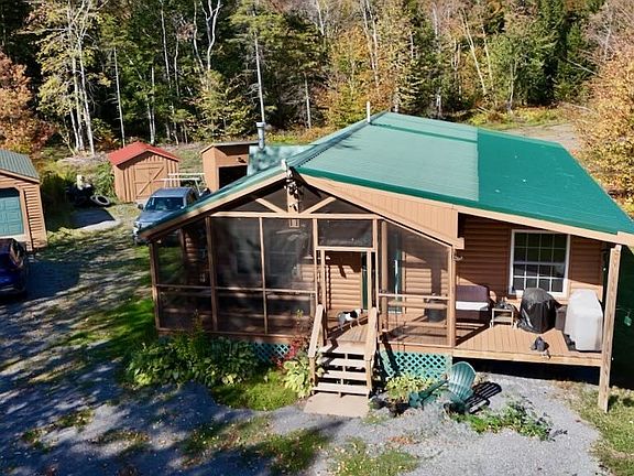 The property boasts a detached garage with a lean-to for storing your belongings and outdoor toys and equipment, a shed for enhanced storage, and a wood shed to keep the cozy fire burning on this chilly nights. The home’s exterior features cedar wood siding, screened in porch, complemented by Pine T&G throughout the inside of the home. A new addition, a 10' x 30' insulated sun room, provides ample natural light and warmth with a new heat pump and A/C to keep you warm in the winter and cool in the summer and adds an additional 300 sq ft of living space not reflected in the tax records. The spacious living room boasts an auxiliary wood fireplace, a pantry, and storage built into the basement stairwell. The basement extends to a full basement, offering additional storage space, a potential additional bedroom, a full bathroom, and a washer-dryer utility room with outdoor access.