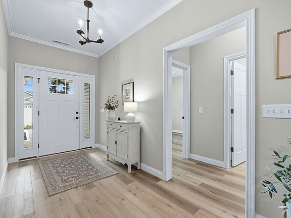 Welcome to this stunning, newly finished, "Majestic Homes" built ranch home in the highly sought-after Raccoon Run Subdivision of Winona Lake. Offering 2,033 sq. ft. of thoughtfully designed living space, this 3-bedroom, 2-bath residence blends modern style with everyday comfort. The open-concept floor plan showcases luxury vinyl plank floors, a spacious living room with custom built-ins, a tray ceiling, and abundant natural light. The designer kitchen is a true centerpiece with dual-toned cabinetry, upgraded appliances, generous counter space, and a breakfast island perfect for casual dining. A nearby dining area flows into the sunroom and out to the screened-in porch and footered patio—ideal for both entertaining and relaxing. The split-bedroom layout ensures privacy, with the primary suite tucked away to one side. Here you’ll find a spa-like en-suite with a double-sink vanity, tiled walk-in shower, and a large walk-in closet that connects directly to the laundry room and mudroom. Additional highlights include a 3-car garage, upgraded finishes throughout, whole yard irrigation, solid core doors, crown molding, In-Line clear drinking water systems, and an unbeatable location—just minutes from US 30, Grace College, the Winona Lake Trails, and the Village at Winona.
