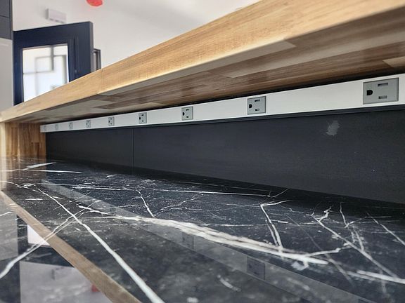 Waterfall edgeStunning kitchenBlack led pendant lightsStainless steel sinkMarquinia select italian countertopsLed strip lightingBuild in appliances