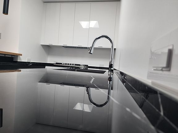 This unit was remodeled by professional high end construction company. With a vision of creating a space where a single person or couple could live in a very relaxed and comfortable place. Starting from a layout that had to accommodate all his design desires and at the same time fulfil: building code requirements, California Title 24 requirements and Burbank Municipal Code. Transferred ideas into architectural drawings, then to create structural plans for the Burbank Planning & Zoning Division - Community Development. After the blueprint plans were approved by the Burbank Community Department, remodeling started. Hour's consultation and designing work to get the final layout. Ambition for striving for the highest level of excellence principles are: geometry, symmetry, balance and proportion. Not to lower these luxury principles and keep functionally of the living space, was a design and construction team goal. They wanted a one-bedroom apartment to be very comfortable, functional and pleasing fundamental Feng Shui rules. Understanding the importance of lighting in our life is another characteristic of this one-bedroom philosophy. Proper lighting is a live touch that shows us the beauty of finish materials and products. It makes our eyes and souls happy. Team spend a lot of time on final selection of products: Italian Marquina kitchen countertops, wooden bar countertop with waterfall, white gloss and black matte kitchen cabinets, Spanish floor tiles, T.M.Cobb interior pocket doors, black matte main entrance door with openable lami-glass, GE washer and dryer, Hansgrohe shower fixtures, Thermador dishwasher, just a few to mention.