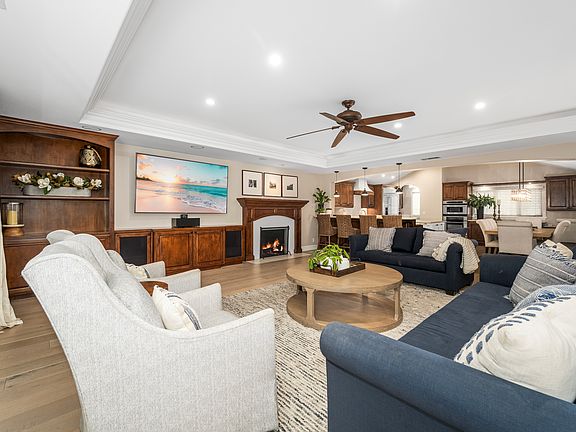 The spacious living room has beautiful pocket doors that bring in an abundance of natural light to the space. These doors lead to a 400 sq. ft. California room complete with a full sectional and swivel chair, a dining table that seats 8, BBQ, built in pizza oven, ice maker, and additional beverage fridge. The jacuzzi, pool, and a two-hole putting green complete the tree lined private backyard.