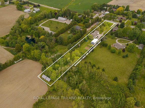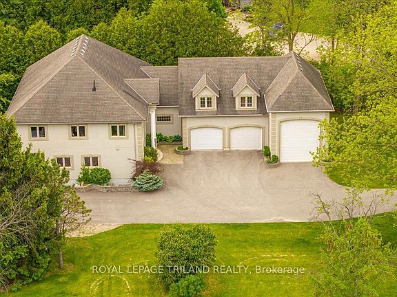 Discover exceptional living in this stunning custom-built home featuring ICF (Insulated Concrete Form) construction for unmatched energy efficiency and durability, perfectly situated on 2 private acres in the desirable town of Strathroy. Experience the grandeur of vaulted ceilings in the expansive main living area, where floor-to-ceiling rear windows showcase your private sanctuary, while the thoughtfully designed kitchen with functional peninsula seamlessly flows into the dining space, complete with garden door access to your outdoor patio. The main floor offers convenience with a 3pc bathroom, a dedicated office space, and easy access through the laundry room to your impressive 3-car garage, where the oversized third bay provides exceptional storage for trailers or workshop space, plus convenient basement access. The upper level provides a quiet retreat with three generous bedrooms plus a primary suite (featuring a private 5 pc ensuite bathroom and owners balcony), a four-piece family bathroom, and a bonus room above the garage offering flexible space currently used as a media room. The fully finished basement maximizes your living space with a large recreation room perfect for family gatherings, two additional bedrooms, a three-piece bathroom, plus practical cold storage and utility rooms for all your household needs. Your private 2-acre oasis provides endless possibilities for outdoor enjoyment, gardening, or simply relaxing in complete privacy, while the substantial 32' x 56' detached shop offers incredible potential for hobbyists, contractors, or anyone needing significant workshop and storage space. This exceptional property offers the perfect blend of luxury, functionality, and privacy in a location that combines rural tranquility with convenient access to amenities - truly a rare find for the discerning buyer.