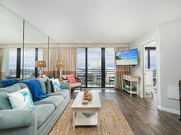 The kitchen comes fully stocked for all your cooking needs and overlooks the dining area with seating for 6 as well as 4 additional bar stools. The ocean view primary suite hosts a king bed, flat screen television, and large closets. The adjoining primary bathroom contains a vanity and large walk-in shower. The guest bedroom has a twin/queen bunk bed, flat-screen television, and double closet. The full, guest bathroom with a shower/tub combo adjoins with the guest bedroom is also accessible from the hallway. Smart TVs in every room.