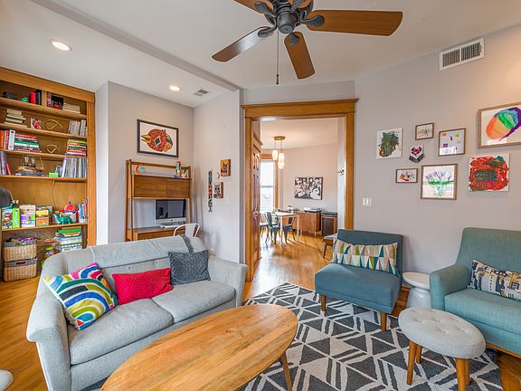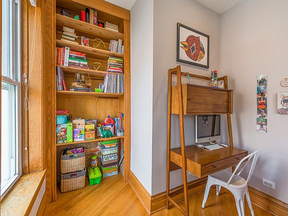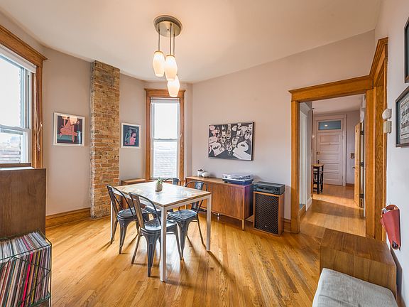 Discover this beautifully renovated top-floor 2 bed / 1 bath home with an additional office nook opening off the living room-perfect for today's lifestyle. Soaring 9.5' ceilings, hardwood floors throughout, exposed brick, original moldings, and vintage details create a warm, timeless feel. The updated kitchen shines with granite countertops, stainless steel appliances, and a classic subway tile backsplash. Relax in the spa-like bath featuring a whirlpool tub. Enjoy the convenience of on-site laundry and an oversized storage area, plus a stunning shared backyard and garden space for outdoor living. Tucked away on a quiet cul-de-sac yet only 3 blocks from the Blue Line and moments from Logan's best dining and nightlife. Garage parking included!