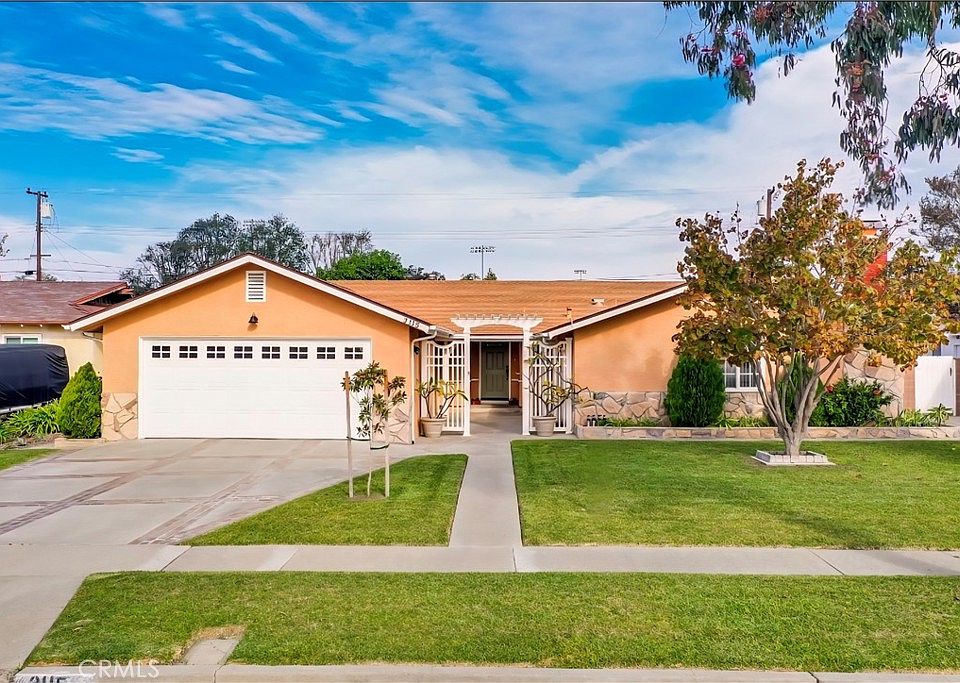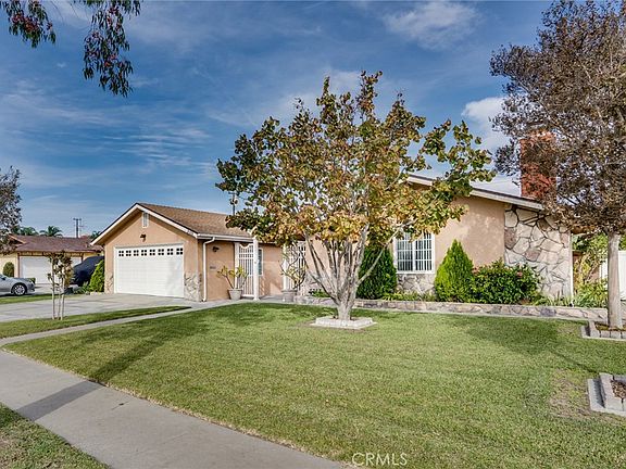 Welcome to this beautifully maintained single-level home in Anaheim featuring 4 spacious bedrooms, 2 updated bathrooms, and approximately 1,950 sq ft of living space on a generous 8,470 sq ft lot. This inviting property combines comfort, charm, and outdoor serenity. Inside, the layout easily connects the dining and kitchen area with both a living room and an additional family room, creating a perfect space for gatherings. The kitchen features plenty of countertop space and deep cabinetry as well as upgraded appliances. The bedrooms are roomy with large closets and the primary bedroom features an en-suite bath. Step outside to your own backyard oasis where you will find a lush garden surrounded by mature fruit trees including an anise, gala, green and pink lady apple trees, an apricot, an avocado, a white, yellow and pink grapefruit trees, a lemon tree, a white and a yellow peach tree, a blood orange tree, a mandarin orange, 2 navel orange trees, 2 Valencia orange trees, a tangerine tree and two pomegranate trees, offering both beauty and homegrown bounty. The expansive patio and lawn area are ideal for relaxing, entertaining, or enjoying California sunsets. Located near shopping, dining, schools, and parks, this single-story gem offers both convenience and tranquility. With a wide driveway, two-car garage, and exceptional curb appeal near the end of a quiet cul de sac, 3115 W Teranimar Dr is ready to welcome you home.