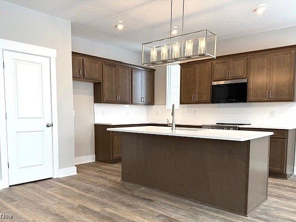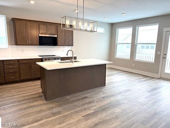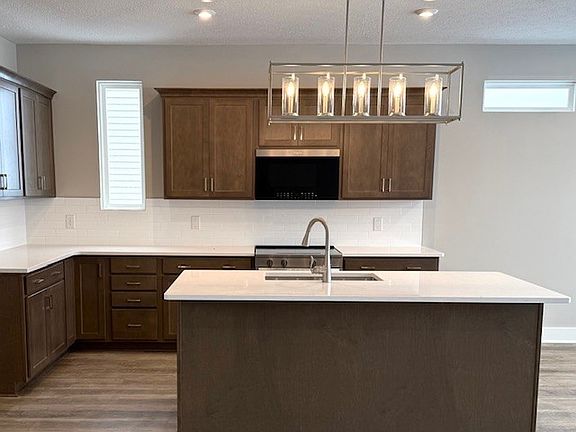 - Description: White quartz countertops with subway tile,Flooring: Luxury Vinyl Tile