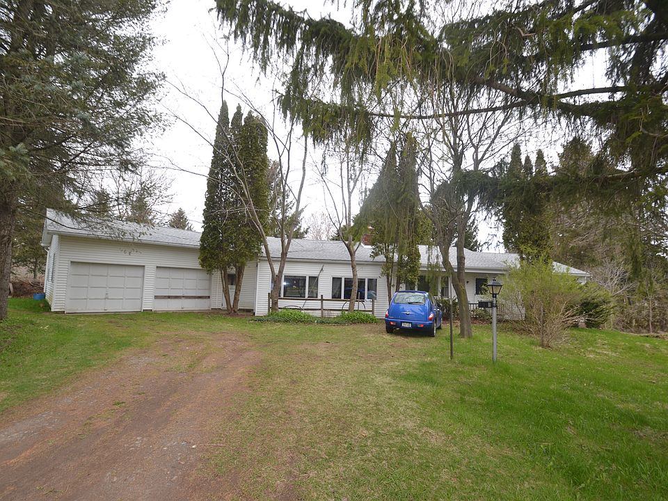 A U C T I O N - SATURDAY MAY 21st ( 10 AM ). OPEN HOUSE SAT MAY 7th ( 12-2) and SUN MAY 15th ( 1-3) ! FINANCING IS AVAILABLE! Starting bid $85,000.! Sprawling 3 bdrm 2.5 bath 1800sf ranch with 2 car GARAGE and several out bldgs on 2.4 acres of ORCHARDS, pines and gardens! HUGE GREAT RM w/beamed ceilings and pegged oak floors. Spacious eat in kitchen! Family room w/ brick FP! NEW ARCHITECTURAL ROOF! Vinyl sided! Generator system! TOWN WATER! AUCTIONEER ( VILLAGE AUCTION COMPANY) ! YOU DONT NEED TO BE A CASH BUYER! You can get financing- plans with 0 down ( if you qualify) !