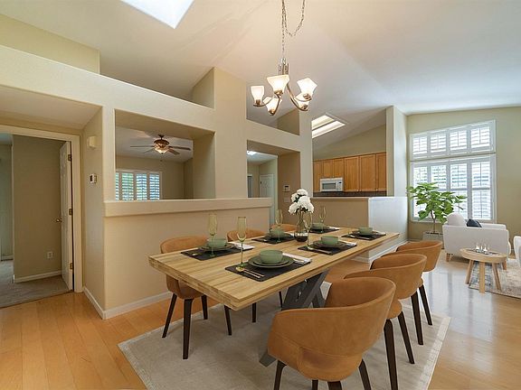 This home has been virtually staged. Adorable home with natural sunlight pouring in, cathedral ceilings and a seamless flow from room to room. You are greeted by your front patio space to relax with your morning coffee and enjoy your evenings in your freshly landscaped front yard. Spacious kitchen with additional outdoor dining opens to cozy family room, formal living room with fireplace and dining room with sky light. Large master bedroom with closet and walk in closet in master bathroom offers private access to outdoor patio. Family bathroom conveniently located down the hall for guests and additional bedrooms. This immaculate, open floor plan offers accessibility, ease and convenience. 2021-06-12