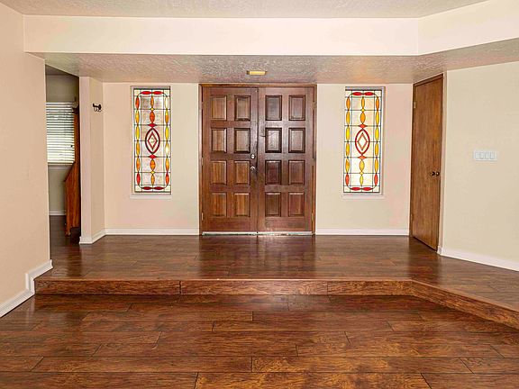 Step through elegant double doors with leaded crystal sidelights into a spacious, sunken great room featuring a cozy fireplace and French doors that open to an airy, open-concept kitchen. The kitchen is equipped with gleaming granite countertops, stainless steel appliances, and a convenient pass-through window-perfect for outdoor entertaining under the covered patio.