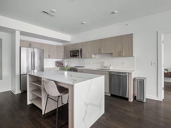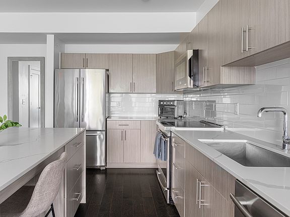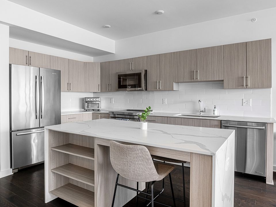 Stainless steel appliancesTop-floor condoModern finishesAbundant natural lightLarge kitchen islandTasteful backsplashSleek quartz countertops