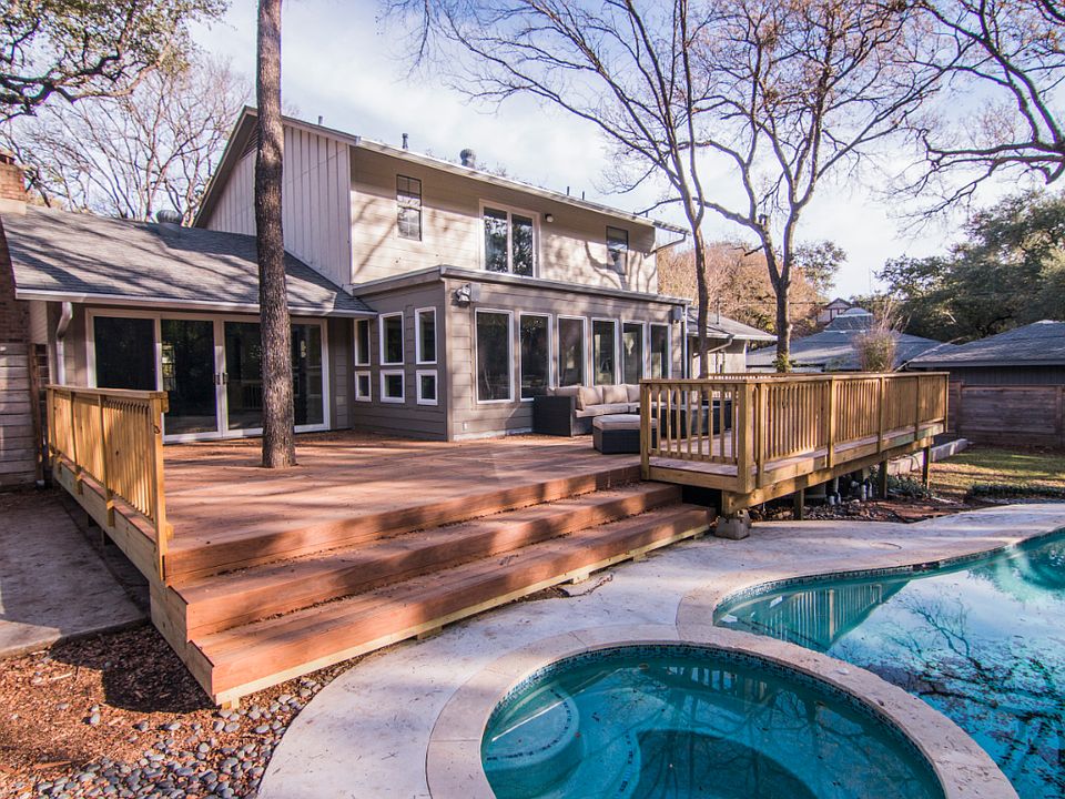 Situated on a private lot in Westlake and backing to a green belt, this home has been remodeled in a beautiful modern style. Offering 5 bedrooms, 2 living spaces, a study, large open kitchen overlooking the greenbelt, and an enormous outdoor deck with a heated swimming pool and hot tub. Close to downtown, shopping, and schools. Owner/agent.