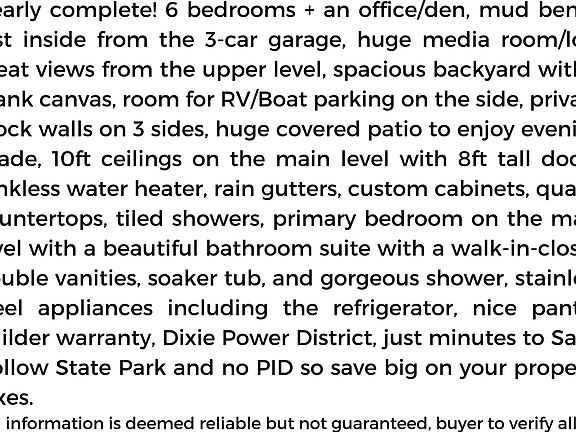 Nearly complete! 6 bedrooms + an office/den, mud bench just inside from the 3-car garage, huge media room/loft, great views from the upper level, spacious backyard with a blank canvas, room for RV/Boat parking on the side, privacy block walls on 3 sides, huge covered patio to enjoy evening shade, 10ft ceilings on the main level with 8ft tall doors, tankless water heater, rain gutters, custom cabinets, quartz countertops, tiled showers, primary bedroom on the main level with a beautiful bathroom suite with a walk-in-closet, double vanities, soaker tub, and gorgeous shower, stainless steel appliances including the refrigerator, nice pantry, builder warranty, Dixie Power District, just minutes to Sand Hollow State Park and no PID so save big on your property taxes. All information is deemed reliable but not guaranteed, buyer to verify all.