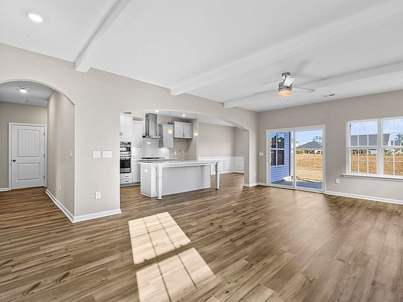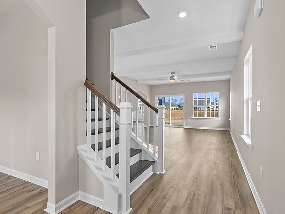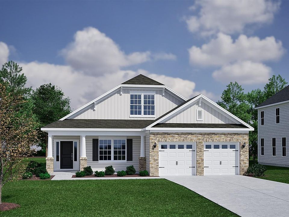 The Jensen offers impressive 2 story living, located on a wooded homesite with the Primary suite down. The office will have French-doors - great for work-at-home! The Front Porch and stone accent provides great curb appeal! As you enter the home, you'll notice the architectural ceiling beams in the great room & spindle stair rail. An arch way between the great room and kitchen adds just the right appeal to the home. The gourmet kitchen features a large island with quartz Countertops, white farmhouse sink, tile backsplash, gas cooktop, wall oven and microwave, and a large eat-in dining space. Classy black and brass lighting and accessories. The primary suite, located on the main level will have a beautiful 60’ x 60” tiled shower, frameless glass enclosure and separate vanities. All baths will have LVP flooring and framed mirrors, and luxury vinyl plank flooring runs throughout the downstairs living areas and Office. The wood-tread finished stairs and stair rail with wood spindles lead you up to the second floor, where 2 additional bedrooms, a bath, a loft, and walk-in attic storage are found. Smart-home-automation is included. Our 1-2-10 year warranty will give you peace of mind. Superior energy efficient construction includes 15 SEER HVAC and R-38 ceiling insulation. Interior photos shown are of a Jensen plan, colors could vary.