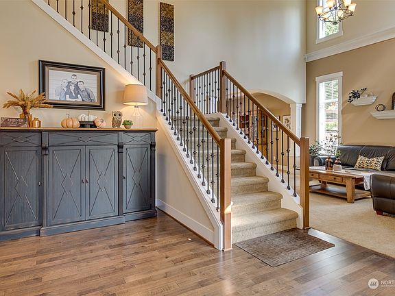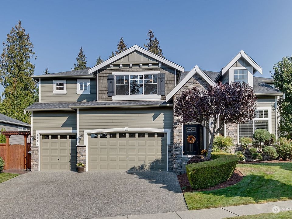 Amazing 2 story home in serene Crown Woods neighborhood. Soaring ceilings, real hardwood flrs, crown molding, SS appliances & newer ext paint. Energy efficient heat pump w/AC. Chef's kitchen w/slab granite counters, undermount silgranit sink, full height tile backsplash, 5 burner gas cooktop, range hood, spacious center island, walk-in pantry w/rainwater glass door & built-in microwave. Gorgeous primary 5-piece en-suite w/soaking tub & tiled shower. Gas FP in family room w/tile surround & wood mantle. Landscaping to the nines. Stunning outdoor living room approximately 20'x30' built w/100-year-old Douglas fir using mortise & tenon method. Gas FP, gas firepit, huge stamped concrete patio & detached wired shed. RV parking & Northshore schools