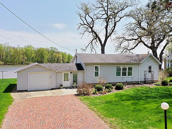 Welcome to riverfront living! This adorable ranch on the Kankakee River is in a prime, boatable location and offers breathtaking views with a beautiful backyard featuring both a patio and a deck - perfect for relaxing or entertaining. The brick driveway adds charm and curb appeal as you arrive. Step inside to a vaulted open-concept living area with a spacious living room and abundant windows on both the front and back, filling the home with natural light. The kitchen includes plenty of cabinet storage, generous counter space, an island with seating, and stainless steel appliances, all flowing into the dining area. A door off the living room/kitchen area leads directly to the deck, creating a seamless indoor-outdoor experience. Gorgeous hardwood floors run through the main living space and bedroom. The bedroom features a cedar-lined closet and hardwood floors. The main floor bath includes a tub/shower combination. The partially finished basement adds functionality with a family room area, a full bath with walk-in shower, laundry area, and utility access. A flexible foyer space includes a coat closet and sliders that open to the patio. Completing the home is a one-car attached garage. Furnace, A/C, and windows are newer. Don't miss this well-maintained riverfront gem in an ideal location for boating and year-round enjoyment!