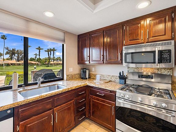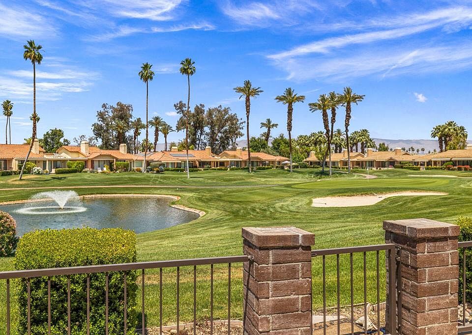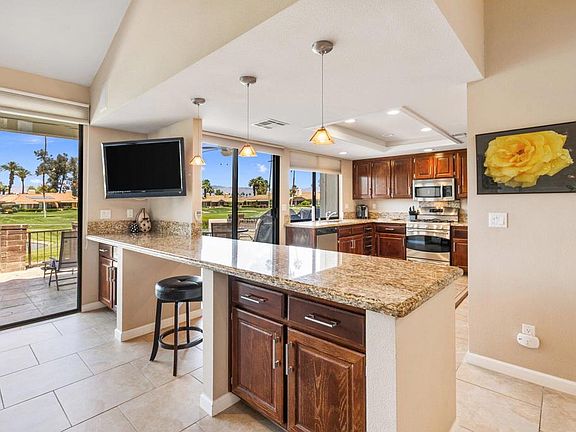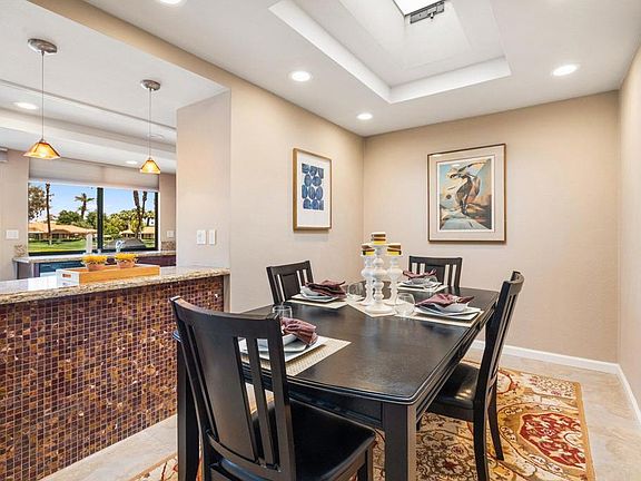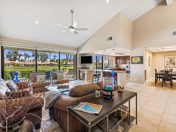 Fabulous fairway, water and mountain VIEWS from the extended patio of this REMODELED, move in ready, 2BD+Den/2BA 300 Max Plan. Open floorplan with professional, contemporary finishes. Recessed LED lighting, designer paint, tile & carpet, custom window coverings, and ceiling fans throughout. Beautiful kitchen remodel features granite counters, stainless GE appliances with gas cooktop, pass-thru to dining, and added counter bar. Kitchen wall has been removed and atrium has been converted, creating a seamless flow from the kitchen to the living areas. Wonderful tile, lighting & hardware in remodeled baths too. Spacious primary bedroom includes a walk-in closet, plus additional storage (or small office) above with a drop-down ladder for access. Large 2-car garage with garage opener installed Aug 2020 & water heater installed Jan 2021. Just steps to a fantastic community pool & spa. Offered designer furnished per inventory list. Annual golf course overseeding in progress. The course will be lush and green by November.