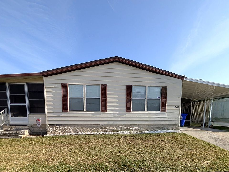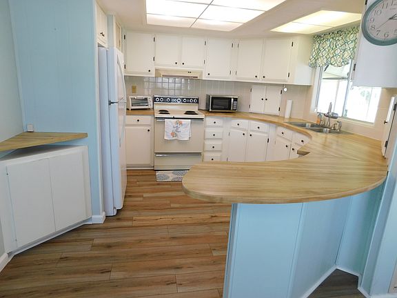 A "MUST-SEE" Beautifully updated 2 bedroom, 2 bath home that offers 1056 square feet of open concept living plus additional accessory spaces including a 10'x12' lanai with vinyl/glass windows, a 12' x 18' screened carport lanai, and an 8' x 12' utility shed. Flooring features gorgeous newly updated laminate supported by 3/4" plywood, and is complimented by quality furnishings and beautifully updated décor including modern contemporary lighting fixtures. Open kitchen features generously spacious white cabinets with plentiful butcher block countertop work space, also has an outside facing window above the kitchen sink. The dining room has a built-in storage unit with upper shelves and glass front door along one wall and affords plentiful space for a large dining table and chairs. The living area is a large 11' x 22' space which enjoys lots of natural light that beautifully compliments the painted interior walls. The living area flows out onto the enclosed lanai through double glass sliding doors. The master bedroom is a comfortable retreat with its own private and spacious ensuite bath featuring walk-in shower. The guest bedroom is adjacent the main hallway bathroom which has been beautifully updated and offers tub shower combo. Walk-in closets add to the plethora of storage options in this home. Home exterior features mesh wire inside the brick skirting to protect home vapor barrier and undercarriage. Home was tented for pest control in March 2025 and is under transferable contract. New air conditioner unit and new carport was installed in 2024. New shingle roof was installed in 2023. Electric panel/breaker box was updated in 2023. Home is equipped with new anchors and tie-downs for added stability in adverse weather. This home is one of a kind and priced to sell. Call for a showing today. Woodbrook Estates is an Active, pet-friendly, 55 Adult community- the monthly Fee Package includes: Land-lease and Use of all Amenities for $772. (No Additional Taxes.)