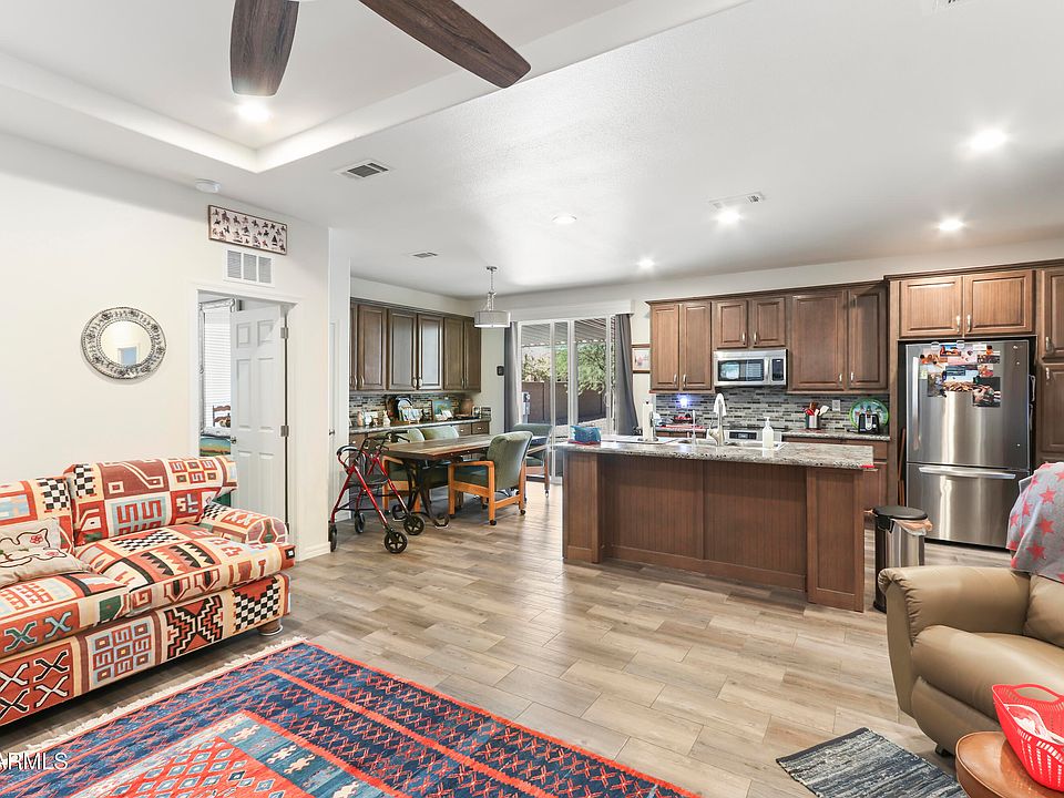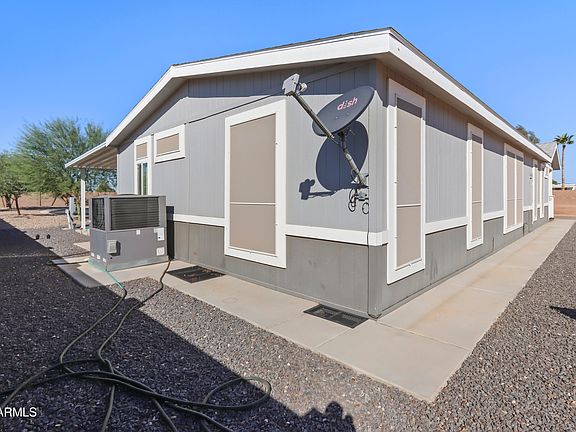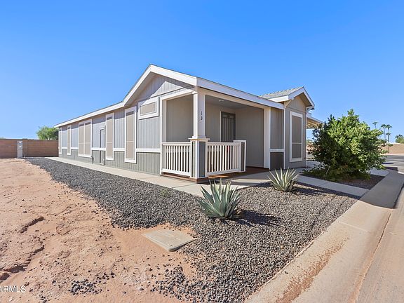 Highly upgraded Cavco build in Spanish Trails West, Casa Grande's vibrant 55+ gated community. This modern, low-maintenance lifestyle, featuring vaulted ceilings, a spacious kitchen island, and a covered patio, is perfect for Arizona evenings. This unique floor plan has 2 master bedrooms and an additional office. No carpet, new washer and dryer, and a new security door. Located in the cul-de-sac. Offers a lot of privacy. Enjoy resort-style amenities including a heated pool, spa, pickleball courts, clubhouse, fitness center, and neighborhood gatherings. Whether you're here year-round or seasonally, this is the ultimate lock-and-leave lifestyle.