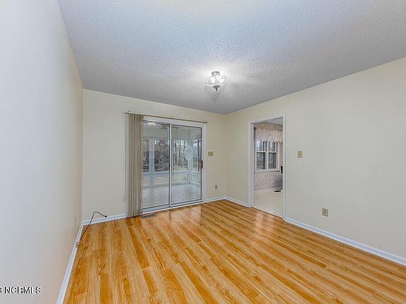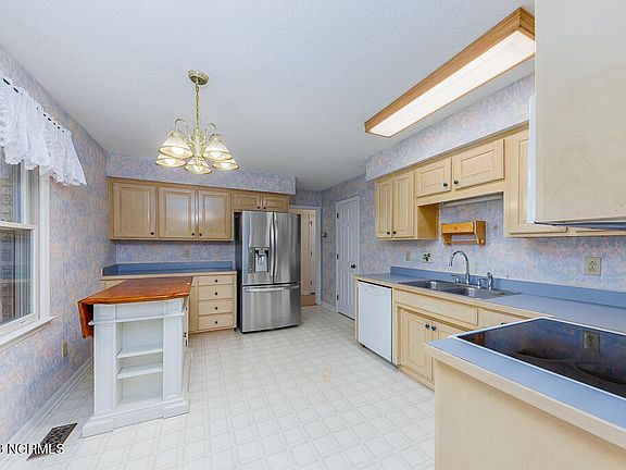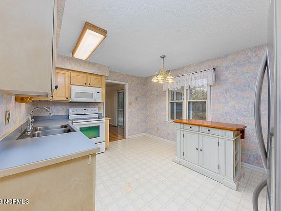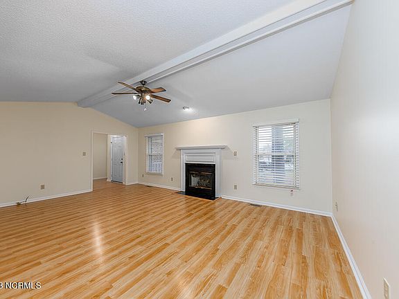 Charming brick ranch with 3 bedrooms and 2 bathrooms is your new canvas for creating a home filled with memories. Nestled on a spacious .39-acre lot in the heart of New Bern, this home is waiting to embrace its new owners! As you approach, a sense of arrival greets you with a long-paved driveway leading to a 2-car garage. The covered front porch invites you to linger and enjoy the serenity of your private lot. Step inside, and you'll find a large living area adorned with luxury vinyl plank flooring, recessed lighting, and vaulted ceilings. The centerpiece? A wood-burning fireplace that beckons cozy evenings this Holiday season. The adjacent formal dining area sets the stage for intimate gatherings and shared meals. The heart of the home, the kitchen, boasts an abundance of cabinet space, ample countertops for culinary creations, and a convenient cooktop. The layout is both functional and open, allowing for seamless entertaining and everyday living. The primary bedroom is a retreat, featuring a generous walk-in closet with built-in shelving and an en-suite bathroom. Pamper yourself in the primary bath, complete with his and her sinks and a walk-in shower. Two additional bedrooms, carpeted for comfort, share a well-appointed full-sized bathroom. The separate laundry room adds practicality to your daily routine. For moments of relaxation and enjoyment, step into the fully enclosed sunroom. With full windows, a ceiling fan, and a wall unit, this space invites you to enjoy the beauty of nature in your own backyard. Step out of the sunroom on to the wood back deck where you will enjoy grilling and entertaining this summer. Your backyard is backed up and surrounded by mature trees giving you the privacy you desire. Located in the sought-after neighborhood of River Bend with a short drive to MCAS Cherry Point.