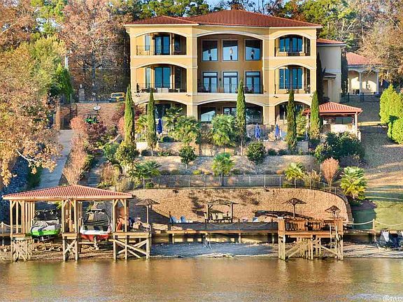 THIS SMART HOME IS THE ULTIMATE IN QUALITY (CONTROLLED BY IPAD), SUPERBLY DESIGNED, WITH FLOWING ARCHED WALKWAYS & SURPRISING SPLASHES OF WORMWOOD WITH HIGH CEILING SPLENDOR. THIS 12,500 SQ FT 5 BEDROOM- 6 FULL BATH- 2 HALF BATH MEDITERRANEAN LAKE HAMILTON HOME HAS PRICELESS VIEWS & ROOM TO S-P-R-E-A-D- OUT. ** VRBO READY ** WHEN ENTERING, NOTICE THE ATTENTION TO DETAIL FOR LAKE VIEWS. FORMAL DINING ROOM, 2 FULL KITCHENS WITH GOURMET APPLIANCES, BREAKFAST NOOKS, CLIMATE-CONTROLLED WINE CELLAR, WALL TO WALL COMFORT--> THIS HOME HAS FOAM INSULATION, 4 GEOTHERMAL HEAT & AIR SYSTEMS (LAKE), 3 TANKLESS HOT WATER HEATERS W/CIRCULATING PUMP, SHAW HARDWOOD FLOORS, WORMWOOD CEILINGS & TRIM, 3 CHANDELIER WINCHES, ALL GRANITE COUNTERTOPS, 2 LAUNDRIES, HEAT & COOLED TRAVERTINE FLOORS DOWNSTAIRS, AUTO STANDBY GENERATOR, OVER 2000 SQ FT OF DECKING (TREK), FULL IRRIGATION SYSTEM, OUTSIDE CABANA W/ KITCHEN & FIRE PIT, HEATED SALT WATER POOL & HOT TUB W/ FLOWING WATERFALL, SAND BEACH W/ TIKI HUT, 2 STALL BOAT DOCKS W/ LIFTS, SWIM DOCK-2-JET SKI RAMPS>