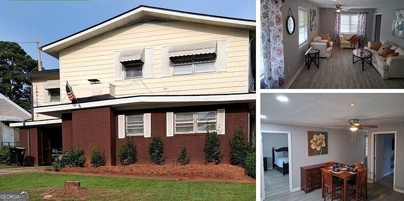 Income potential and eligible for 100% USDA no-down payment financing. This updated 6-bedroom, 4-bathroom home presents so many options in 3,760 sq ft of flexible living space. Two complete living areas-each with its own kitchen-make it ideal for multi-generational living or "live in one, rent the other." Lock-off capable: the two floors can be separated and secured to control access. Downstairs offers four bedrooms & 3 bathrooms with tile-surround features, open sit-in kitchen, and a large den with fireplace. Upstairs features a living room/den and two bedrooms, including an oversized owner's suite with an attached office/sitting room. This is an open-concept space with a kitchen/dining area that flows outside to an enormous covered veranda with bar and metal roof-perfect for entertaining. Recent upgrades include a new architectural-shingle roof, updated kitchens and baths, fresh paint, new LVP and tile flooring, and the 2nd story outdoor bar area. Two separate driveways provide easy parking and privacy. It comes with an appliance package in both kitchens, along with washer and dryer. Can be purchased furnished for a turnkey move-in or rental setup. Sold as-is, and the seller will provide a comprehensive 1-year home warranty at closing with an acceptable offer.