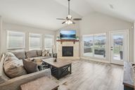 Granite countersStainless appliancesWood look tile floorsFountain viewCovered patioSoaring vaulted ceilingStone elevation