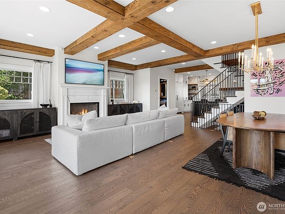 Beautifully reimagined from the studs out, this Queen Anne home blends timeless craftsmanship with modern luxury. Wooden beams and hardwood floors set the tone, while the chef’s kitchen boasts soapstone and marble counters, inset cabinetry, and Thermador appliances. Sweeping views of Seattle and Elliott Bay fill the living room, and the primary suite offers a rooftop deck and spa-like bath. Upstairs hosts three bedrooms and laundry, while the lower level with private entry is ideal for a mother-in-law. Seller invested $45K in the backyard with custom stonework, patio, playset, and garage.
