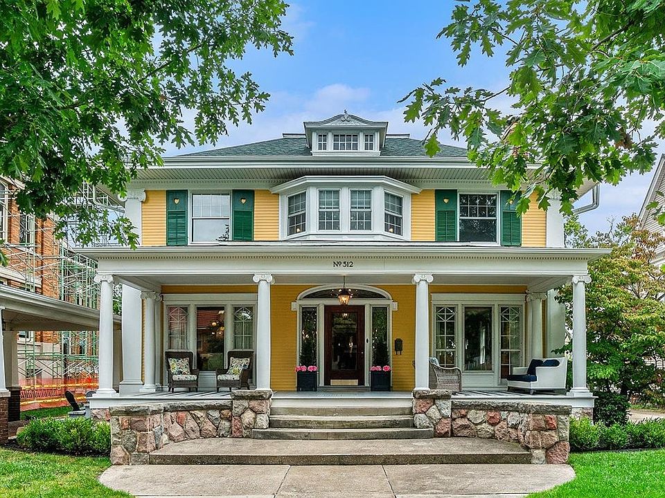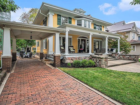 Step into a piece of history with the iconic Whitmer House, a two-story treasure nestled in the heart of downtown Goshen. This historic masterpiece effortlessly combines old-world craftsmanship with modern comforts, offering 4 generously sized bedrooms and 2.5 baths. With stunning mahogany woodwork, a graceful rounded stairway, white oak floors, and exquisite mosaic tile accents, every corner of this home speaks of timeless elegance. The inviting vestibule, with its beautifully detailed leaded glass windows, welcomes you inside, where you’ll find pocket doors, a marble vanity, and rich brass electric and gas light fixtures—each detail adding to the home's historic charm. A formal dining room, graced by a hand-painted mural by former owner, Lincoln J. Carter, sets the stage for memorable gatherings. The owner’s suite is a serene retreat, featuring an updated private bath, a dressing room, and a cozy den or private office—perfect for remote work or relaxation. The fully restored front porch serves as the home’s iconic focal point, inviting you to sit back and enjoy the views of your quaint brick driveway, which leads to a carport, further enhancing the home’s curb appeal. But the Whitmer House offers even more: a unique two-unit Carriage House, complete with two fully rented units (a 2-bedroom and a 1-bedroom), ideal for generating income or housing guests and extended family. Situated just steps from downtown, this extraordinary property is an unparalleled opportunity to own a piece of Goshen’s rich history, all while enjoying modern amenities and the potential for rental income.