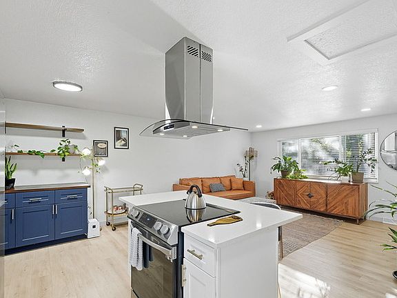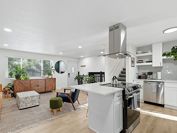 Open-Concept Main Level: Light-filled living room flows into the kitchen and dining area with hardwood-style flooring throughout.