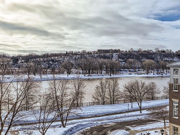Sunny, Upper Landing open-concept condo; west/southwest facing floor-to-ceiling windows with river views, including balcony with powered awning. Cherry cabinets and wood floors in main living space are complemented by the maple molding throughout. Updates to the unit since acquired by 2nd owner in 2018 include painting, new washer/dryer, dishwasher, refrigerator, water heater, Trane furnace and NCP air conditioner. Master bedroom includes walk in closet with custom shelving, ensuite bathroom with double vanity, separate whirlpool tub and shower, and ceramic floors. Guest bathroom also has tub/shower with ceramic floors. Enjoy the fireplace on cool fall evenings, pack up in the winter and the HOA takes care of the snow. Two underground parking spaces with adjacent 10’ x 10’ secure storage cage. Walk to Xcel Energy Center for entertainment, restaurants along west seventh, and stroll along the scenic river paths. Rare floor plan -with bedrooms on opposite ends and an interior den.