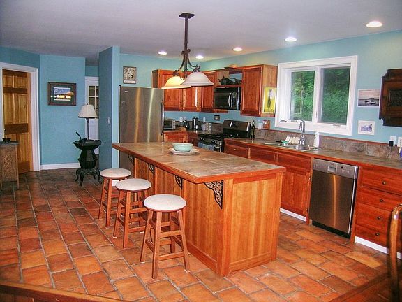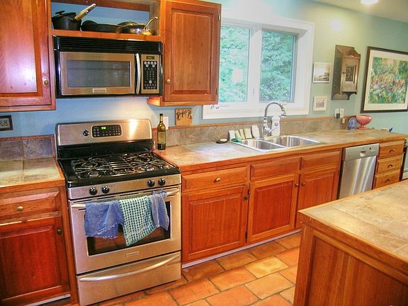 Nestled on a hillside wooded lot, this nicely finished Cape is the complete package. The main floor is open and inviting with cherry flooring in the living/dining areas and large hand made Mexican terracotta tiles in the kitchen and full bath. The kitchen has a large work island that doubles as a breakfast bar with large storage drawers plus trash and recycling bins. The kitchen counters are granite tiles and the custom cabinets are natural cherry. The living room has a stone hearth with a beautiful Hearthstone woodstove as a super attractive alternative heat source. Upstairs above the living room is a balconied den with cherry floors and wraught iron railings. The master bedroom includes a large master bath with bluestone tile floors, his and hers walk-in closets and a 16x21 bed chamber. The partially finished lower level has grade level windows for ample natural light and two good sized guest bedrooms. The balance of the basement has a laundry center and lots of dry storage space.