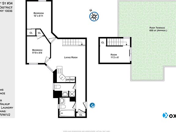 This stunning duplex apartment comes with a private 600 square foot roof terrace that is perfect for entertaining or relaxing under the stars. Come home to a beautifully renovated kitchen, featuring modern appliances and a convenient dishwasher. Enjoy the charm of exposed brick walls and the luxury of two full windowed bathrooms, providing ample ventilation. 4 closets throughout help keep your belongings neatly tucked away and promote a clutter-free living environment.