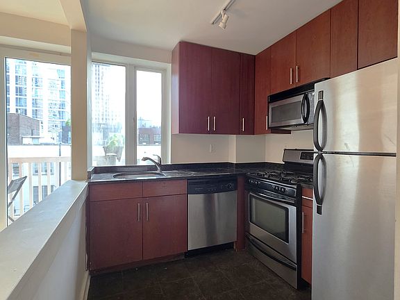 Spacious and bright one-bedroom with private balcony in a prime Midtown West location. This south-facing home features large windows that flood the space with natural light. The living room includes a dining alcove, while the open, windowed kitchen is furnished with cherry wood cabinetry, stainless steel appliances, and a dishwasher.