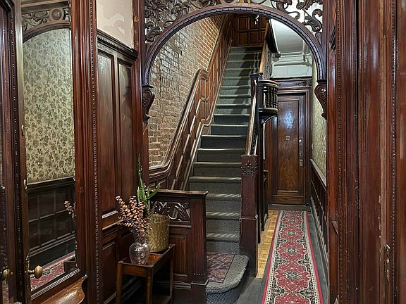 2-bedroom 1-bath apartment on the parlor floor with shared washer-dryer in the basement. The apartment has a decorative fireplace. The primary bedroom faces out onto W 98th St, and the second bedroom faces the rear of the building.