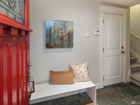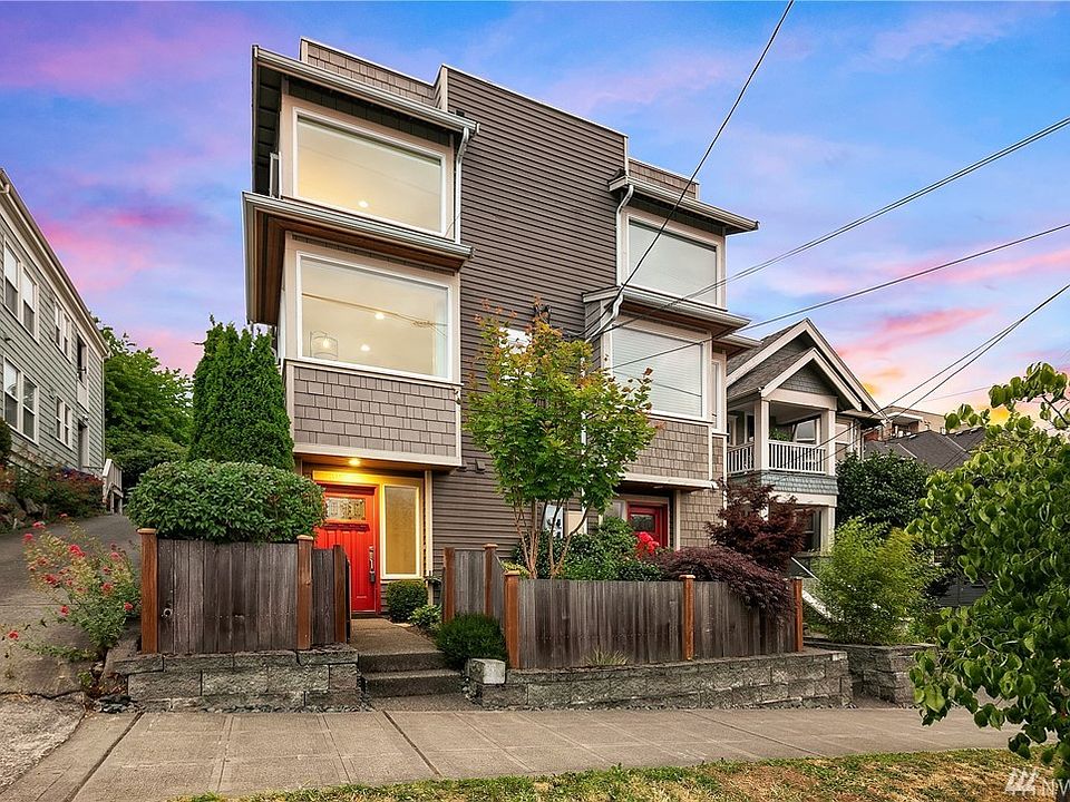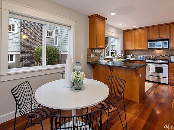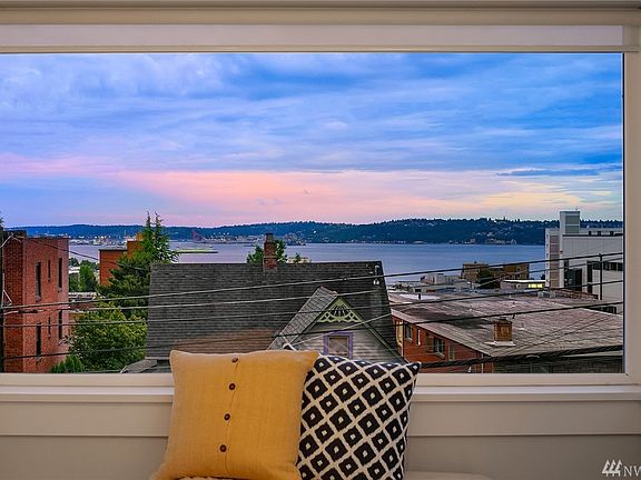 Sun Filled SW corner unit with gorgeous views of Sound, City & Mtns.A fenced Garden courtyard leads to the slate floored entry, laundry & 1 car garage with storage. Main floor with Brazilian Cherry Hardwoods, gas fireplace, built in floor to ceiling book shelf, custom blinds, Bosch washer/dryer. Brand new carpet & freshly painted Penthouse gray interiors. Extra space on top floor for storage not included in SF. Large roof top deck with gas for BBQ. Outstanding location! Original Owners!