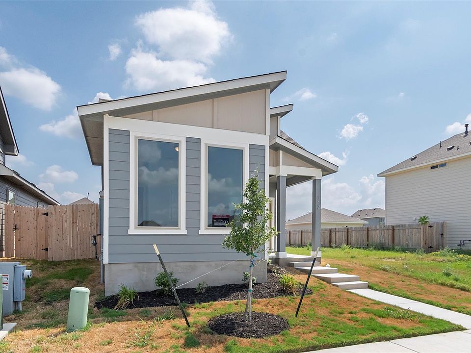 MLS# 4193520 - Built by Pacesetter Homes - Ready Now! ~ Discover modern living in this beautifully crafted single-family residence located in the desirable Blanco Vista Heritage Point subdivision. This newly completed home, built in 2025, encompasses 1,171 square feet of thoughtfully designed space, featuring three spacious bedrooms. With two full bathrooms, the home offers a double vanity in the primary suite, perfect for busy mornings. The open floorplan seamlessly integrates the living and dining areas, creating a warm and inviting atmosphere. Enjoy the convenience of modern amenities with dedicated hookups for both a washer and dryer, as well as a pantry for all your storage needs. The interior is enhanced by ceiling fans in both the primary bedroom and living room, and plush carpeting, offering a cozy yet stylish environment. Step outside to a private yard, beautifully landscaped, featuring a 10x10 patio! The home is equipped with central heating and cooling systems, ensuring comfort throughout the seasons. Located within the esteemed Hays CISD, this property is in close proximity to Blanco Vista Elementary, Laura B Wallace Middle School, and Jack C Hays High School. This residence is ready for you to make it your own!