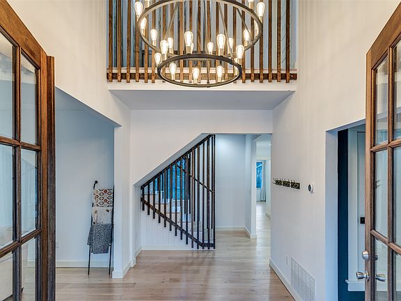 Walk through the double doors and it hits you immediately. Soaring ceilings. Floor-to-ceiling windows. Light everywhere. Clean, contrasting lines that are purposeful and chosen, not trendy. A fireplace that anchors the space without begging for attention. Living. Dining. Kitchen. All visible. All connected. All dialed in.