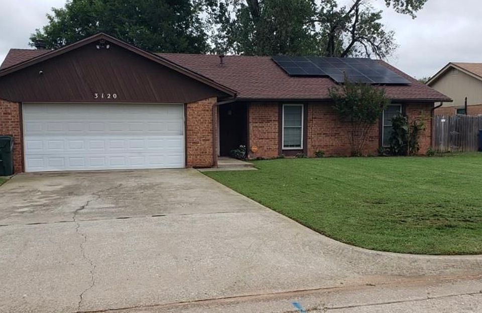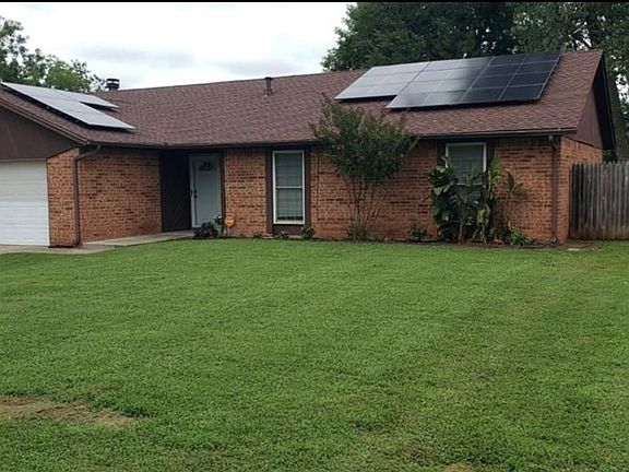 This is a 3 bedroom, 2 bath, 2 car garage single family home with a very spacious living room and a fireplace and a nice sized backyard with a recently replaced privacy fence. Roof was replaced in July 2025. Furnace was converted to electric in November 2020. Installed solar panels offer a very low electric bill. Very close commute to Tinker AFB.