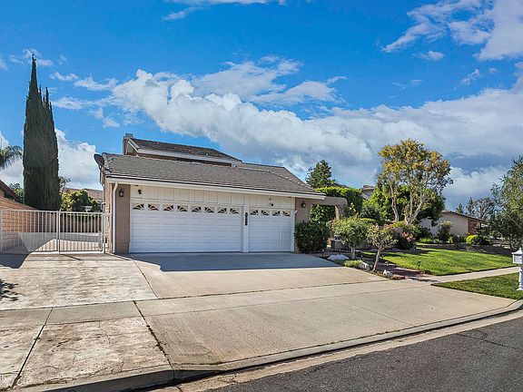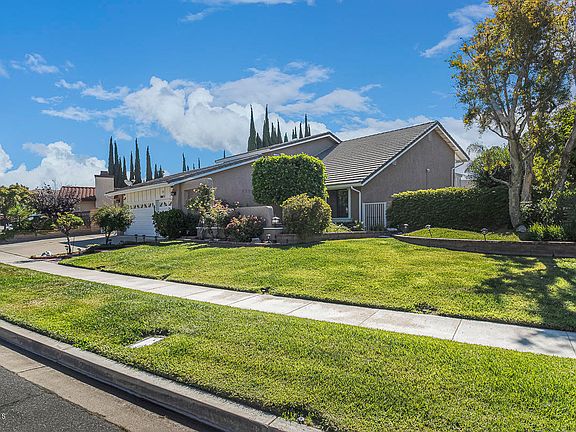 This 4 Bdr, 3 Bath Fountainwood home has 2568 SF. Enter this lovely home through the front courtyard. The spacious living room features wood shelves and leads to the formal Dining Room. The kitchen features KitchenAid double oven, microwave and large 5 burner cooktop, a breakfast bar and walk in pantry. The Family Room features a brick fireplace, built in desk and slider leading to the rear yard. Downstairs features a full bath and bedroom which has been converted to a stunning wine cellar with split cooling system, entertain your guests here and enjoy! The 3-car garage features an enclosed laundry room in part of the single car side. Upstairs are two large secondary bedrooms and full hall bathroom. Double doors lead to your master bedroom with large walk-in closet and private balcony. The Master bath has dual sinks, separate tub and shower and a toilet room. The rear yard is an entertaining dream. A huge covered patio, two ceiling fans, fountain and plenty of open area to relax. The side yard has a huge 80' RV parking with 50 AMP service and dump access, and a large covered work area with secondary laundry and refrigerator. This home features an energy effective PAID solar system. Close to Rancho Tapo Park, Civic Center, Shopping and Restaurants