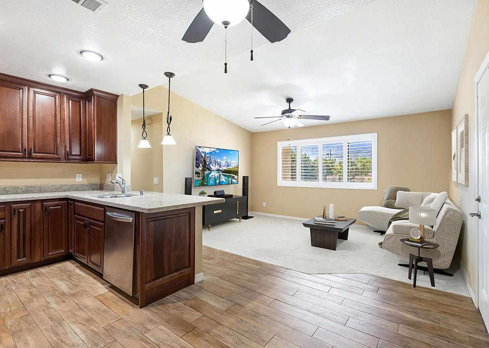 Enjoy Picturesque Mountain Views from this 3 Bedroom - 2 Bath Home. This Custom Home features hickory cabinetry in the kitchen complimented by granite countertops and brand new carpeting throughout, all appliances upgraded and a light and bright livingroom with vaulted ceilings and perfectly framed views of the San Jacinto Mountains- You can even watch the Tram as it departs! The Primary, w/ en suite, has beautiful Western Mountain Views via direct balcony access and features a contemporary slate & glass shower with stylish vanity and fixtures. Second bathroom completely updated with a fully tiled shower. Second bedroom has additional balcony access as well. Full size washer and dryer with additional storage closet in hallway. Spend your time enjoying the views and desert lifestyle rather than working on renovation projects. Check out the New Look at Cathedral Springs - A gated community conveniently located just 10 minutes from Downtown Palm Springs. Amenities include a fitness center, multiple pools and spas as well as Low HOA's. This home is on FEE Land (Not lease land). Some photos virtually staged.