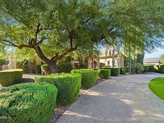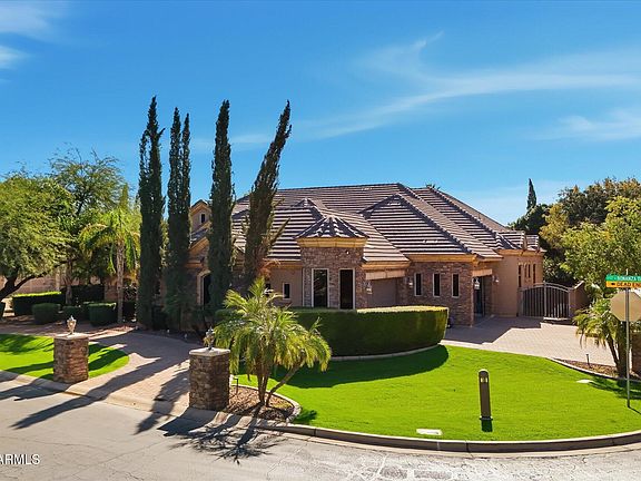 Car enthusiasts will love the 6-car garage, a 4-car tandem plus 2-car extra-deep bay, with epoxy floors, custom cabinetry, and a workbench. Additional upgrades include tankless and gas water heaters, central vacuum, coffered ceilings, newer lighting, Soft drawer slide outs through-out kitchen. 3" wood shutters through-out, surround sound through-out. Walking access to a 6.5-acre greenbelt park. This home perfectly blends elegance, comfort, and entertainment, a true masterpiece in one of Gilbert's most sought-after communities.