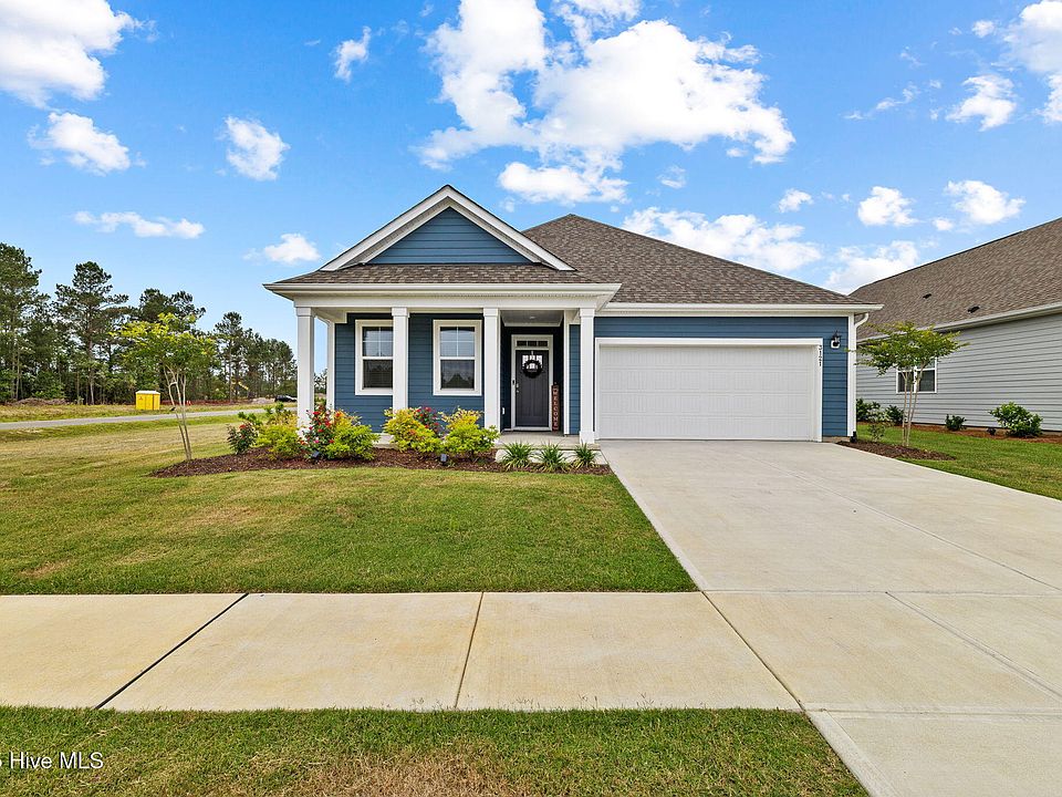 Welcome to the Aria, one of the thoughtfully designed one-story floorplans featured in Hazel Branch at Brunswick Forest. This 3-bedroom, 2-bathroom home offers 1,654 square feet of open-concept living space and designer details throughout. A standout feature of this home is the great room's shiplap accent wall, beautifully enhanced by a floating mantle and cozy fireplace, adding warmth and character to the heart of the home. The open floor plan flows seamlessly into the kitchen and dining area, creating an ideal space for entertaining and everyday living. The kitchen is a showstopper, complete with a spacious granite island, stainless steel appliances, and an oversized pantry. From the dining area, step out onto the screened lanai, where you can unwind and enjoy peaceful nature views in a comfortable outdoor setting. In addition to these stylish and functional design elements, this home also includes Home Is Connected® Smart Home Technology, featuring a touchscreen interface, video doorbell, front door light, z-wave thermostat, and door lock, all controlled via an included Alexa Pop and smartphone app with voice control—bringing convenience and peace of mind right to your fingertips. The Primary Suite also showcases a stunning accent wall that creates a refined focal point in the room, and features a massive walk-in closet along with a luxurious bathroom complete with a walk-in shower, linen closet, and dual vanity.