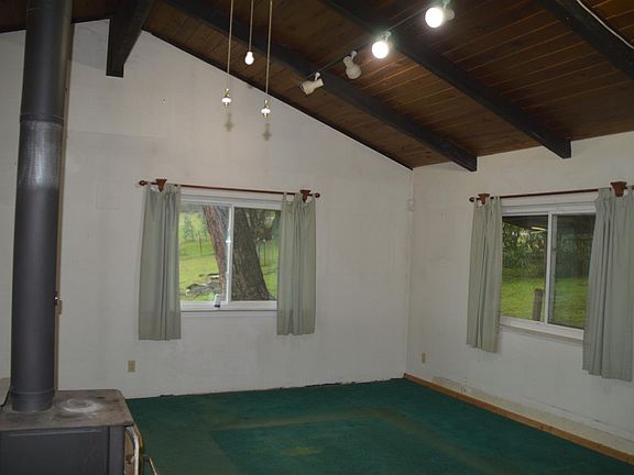 This cozy 2 bedroom, one bathroom home has vaulted ceilings, which gives it charm and feels larger than its actual square footage. The house sits on 4.21 acres with many rock outcroppings and trees. There is a workshop/shed with electricity. The house needs some TLC.