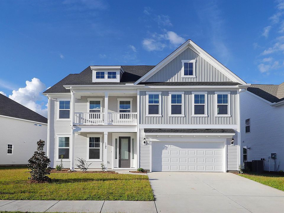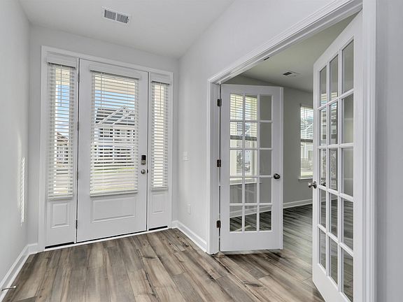 Curb appeal galore-2 story home with 8-foot glass front door, an office, enlarged covered porch on a private wooded homesite, plus a guest bedroom and full bath with tile shower and a powder room downstairs. Upstairs you'll find the large primary suite with 2 walk-in closets, a 9-foot tiled shower with dual shower heads, and access to the 2nd floor balcony. 3 other bedrooms with walk-in closets, and a large 15' x 13' bedroom with closet are located upstairs. Yes, that is 6 bedrooms! Tons of upgrades include a coffered ceiling in the family room, gourmet kitchen with gas cooktop, wall oven and profile appliances, stainless steel farmhouse sink, walk-in pantry, and upgrade cabinetry with soft close drawers and doors. Bench and cubbies at your garage entrance! Crown molding and other upgrades too numerous to list, this home is a must-see! Smart Home Automation is included. Our 1-2-10 year warranty will give your buyers peace of mind. Superior energy efficient construction includes 15 SEER HVAC and R-38 ceiling insulation. Photos are of a similar home for reference only - colors, options and features may be different.