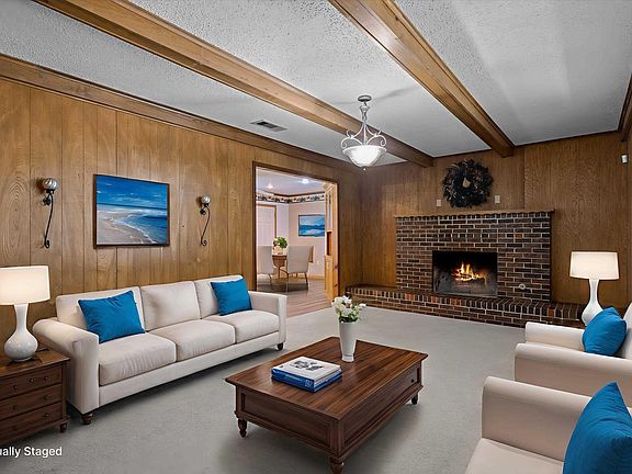 Cozy wood-burning fireplaceTwo-car carportAbundant countertop spaceLarge covered deckStorage unitCustom wood cabinetryExpansive kitchen