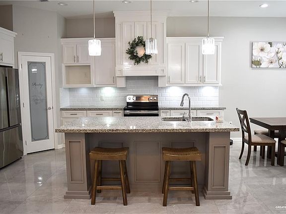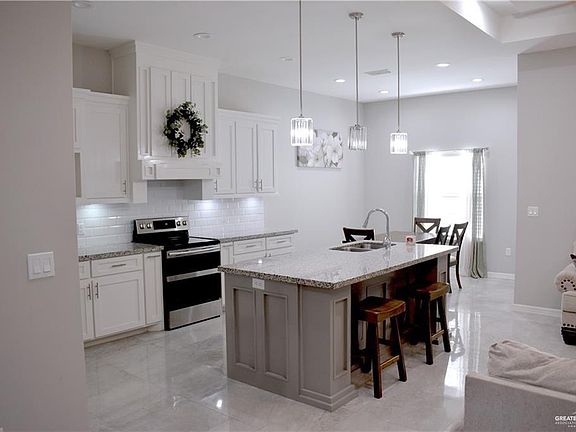Step into modern elegance with this stunning rental home featuring a beautifully designed open-concept layout. The heart of the home boasts a sleek kitchen complete with granite countertops, a spacious island with bar seating, stainless steel appliances, custom cabinetry, and a walk-in pantry with decorative glass detailing. Pendant lighting and under-cabinet illumination create a warm and inviting ambiance perfect for entertaining or family gatherings. The adjoining dining area offers plenty of natural light and complements the home's stylish, neutral tones and polished tile flooring throughout. This home offers both comfort and sophistication ideal for anyone seeking a move-in-ready space that blends luxury with functionality. This home is move-in ready with the fridge and stove included in the rental lease. Call today!