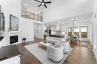 Corner cast-stone fireplaceWall of windowsHardwood floorsFormal dining roomBack covered patioTwo generous walk-in closetsLuxurious en-suite bathroom